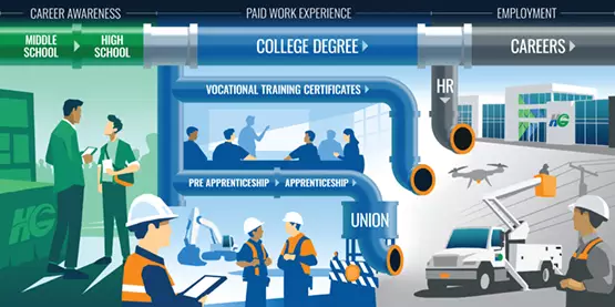 Powering People and ProgressWherever we build physical infrastructure, we simultaneously build up the community by removing barriers and developing on-ramps to careers with good wages for individuals and growth opportunities for businesses.